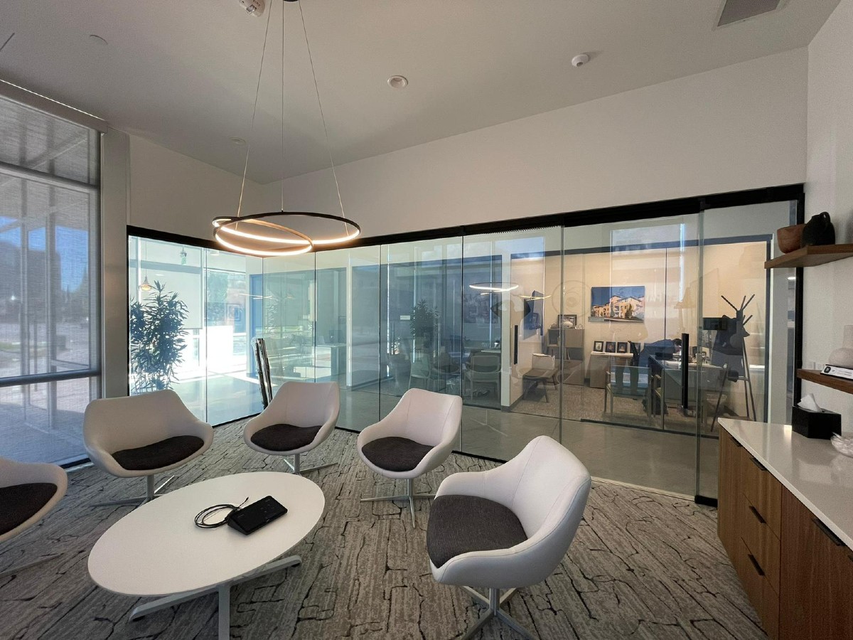 This leading commercial real estate investor sought a multi-functional and ultra-modern upgrade to their conference room. Gauzy’s grey adhesive smart film was installed across 450 sqft of glass transforming this space. Controlled using Lutron Pico, the smart glass switches from transparent to opaque on demand from anywhere in the room. The design upgrade provides management and clients with the flexibility to control their office environment in seconds and enhances the sleek, minimalist feel of the space. Notably, the smart glass is also installed on the acoustic sliding door, ensuring the entire interior glass partitions maintains the same aesthetic. The smart glass film was installed by Gauzy’s trusted and valued partner, Griffith Window Tinting.