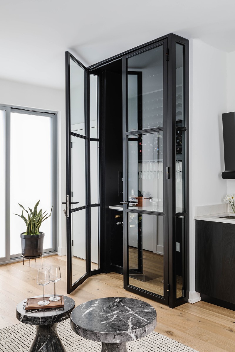 In this luxury condo in Brush Park, Michigan, Gauzy LCG® smart glass is installed on the third and fourth floors, in the kitchen and main living areas of the residence. The glass was specified by the design group for the project – Patrick Thompson Design. Located in the external facing windows that block the neighboring building from seeing in without the need for shades or curtains, the smart glass maintains a clean finish, allowing other elements of the interior design to shine.
